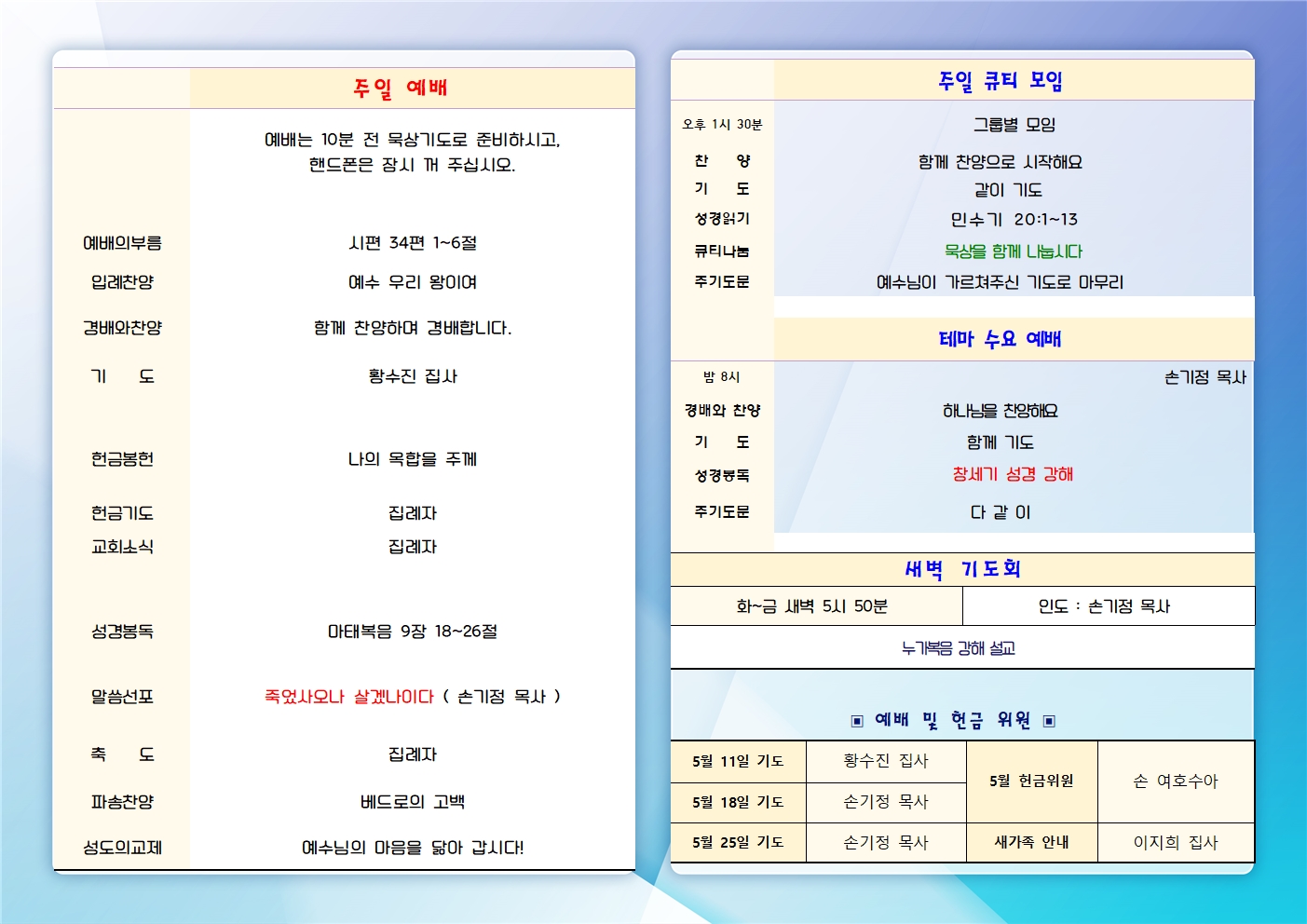 | 2025년 5월 18일 주일예배 주보 (0) | 2025.05.18 |