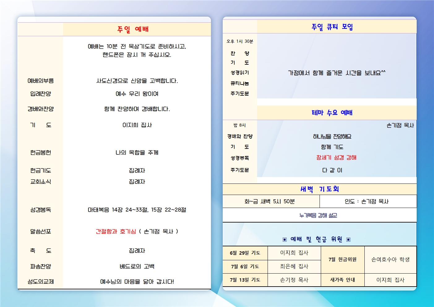 | 2025년 7월 13일 주일예배 주보 (0) | 2025.07.13 |