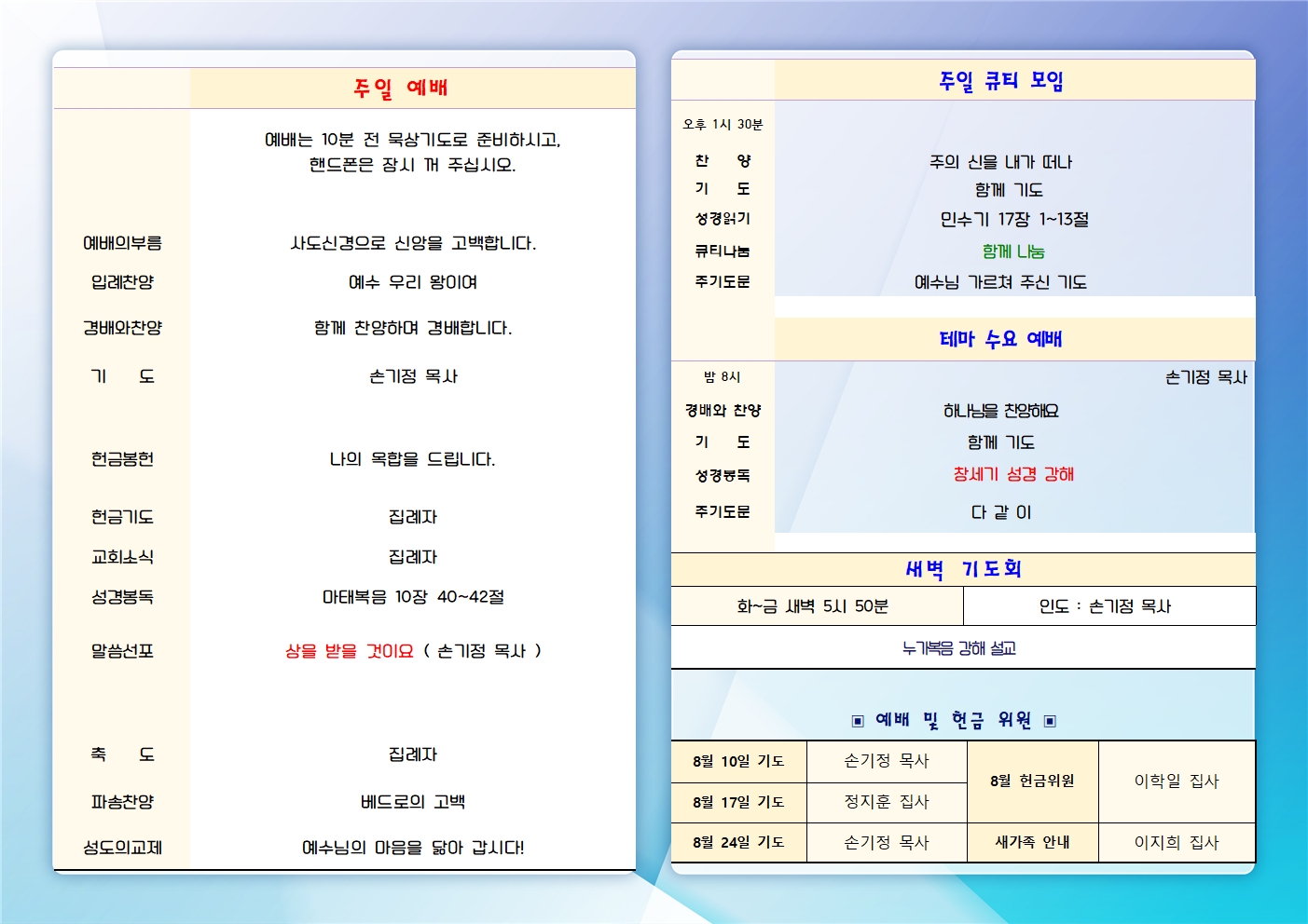 | 2025년 8월 17일 주일예배 주보 (0) | 2025.08.17 |