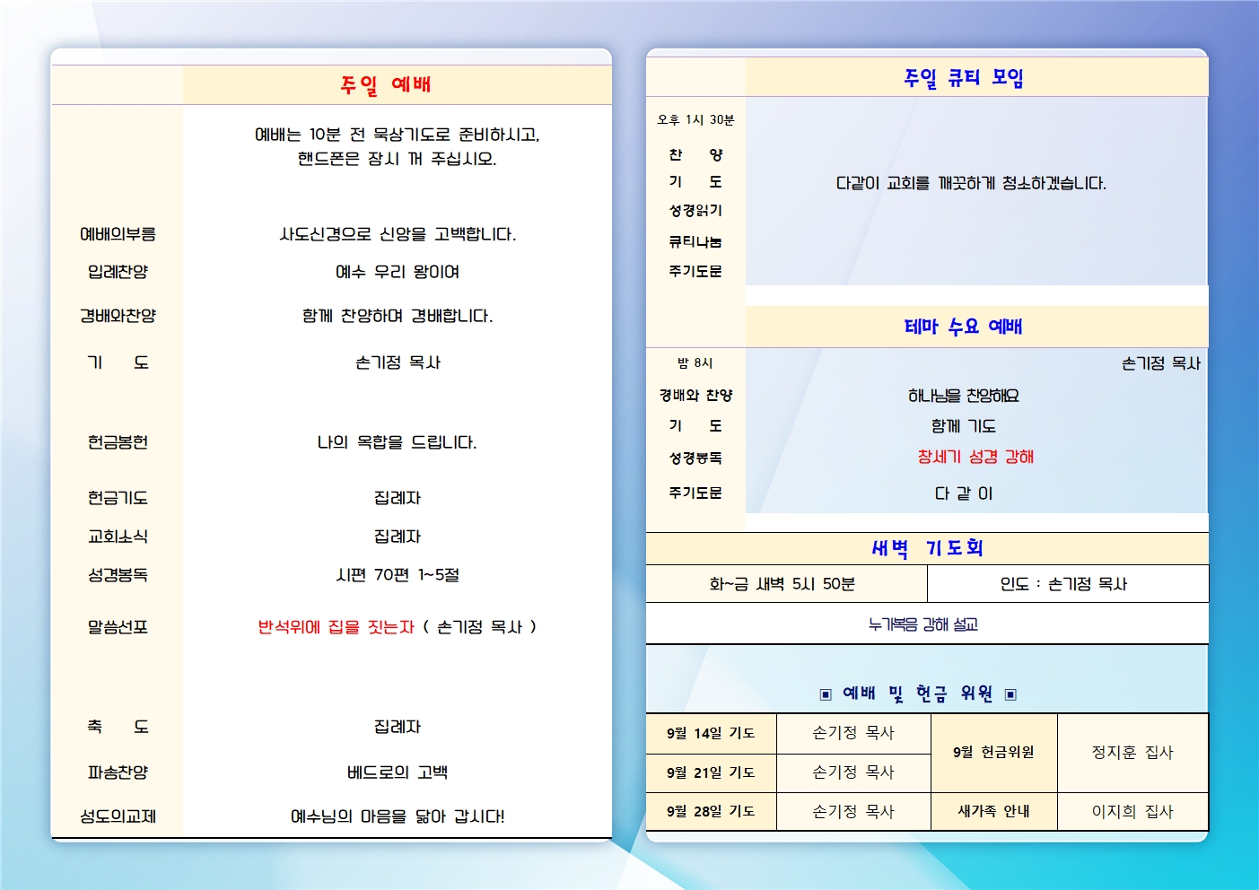 | 2025년 9월 7일 주일예배 주보 (0) | 2025.09.07 |