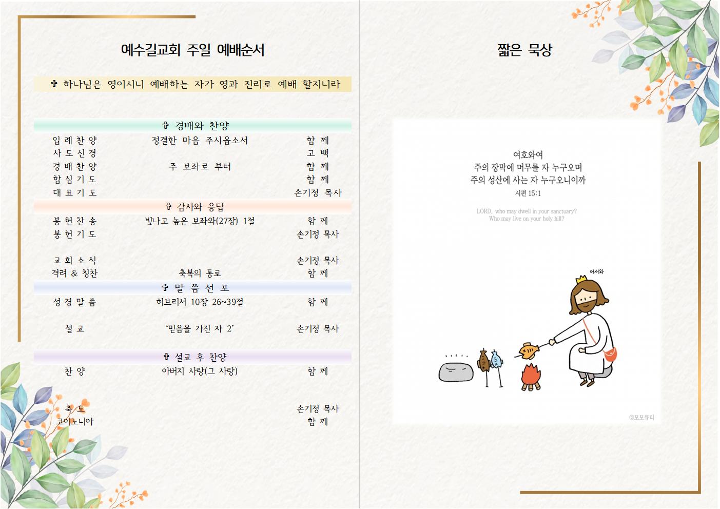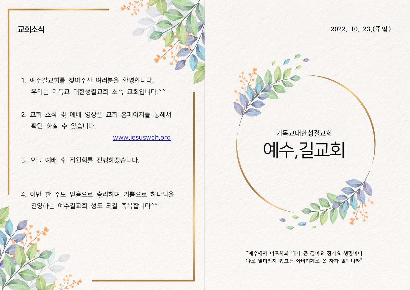 | 2022년 10월 9일 예수길교회 주보 (0) | 2022.10.08 |