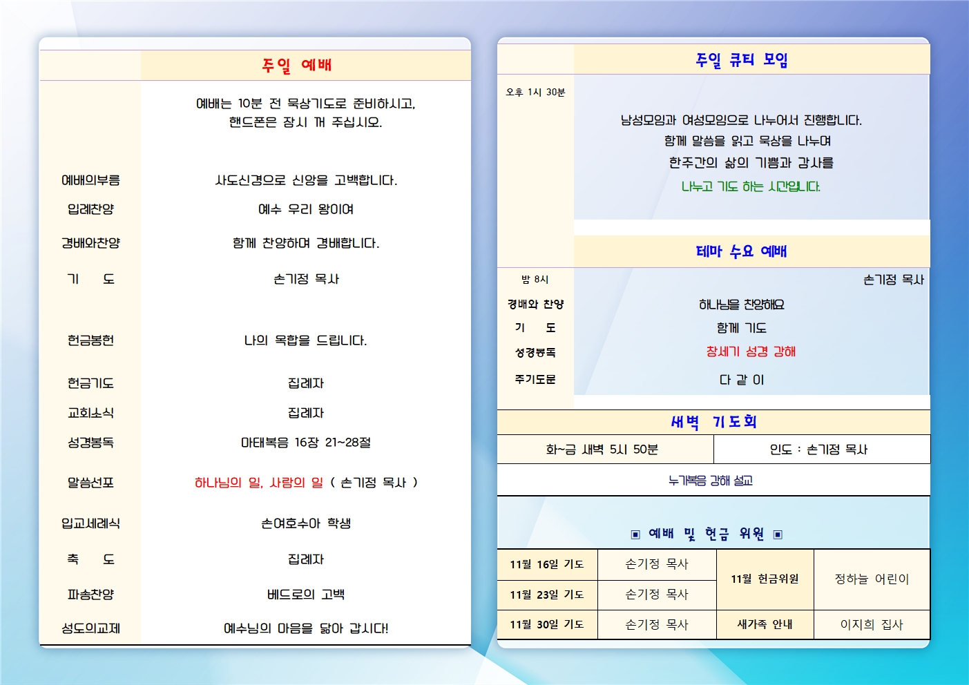 | 2025년 11월 23일 주일예배 주보 (0) | 2025.11.23 |