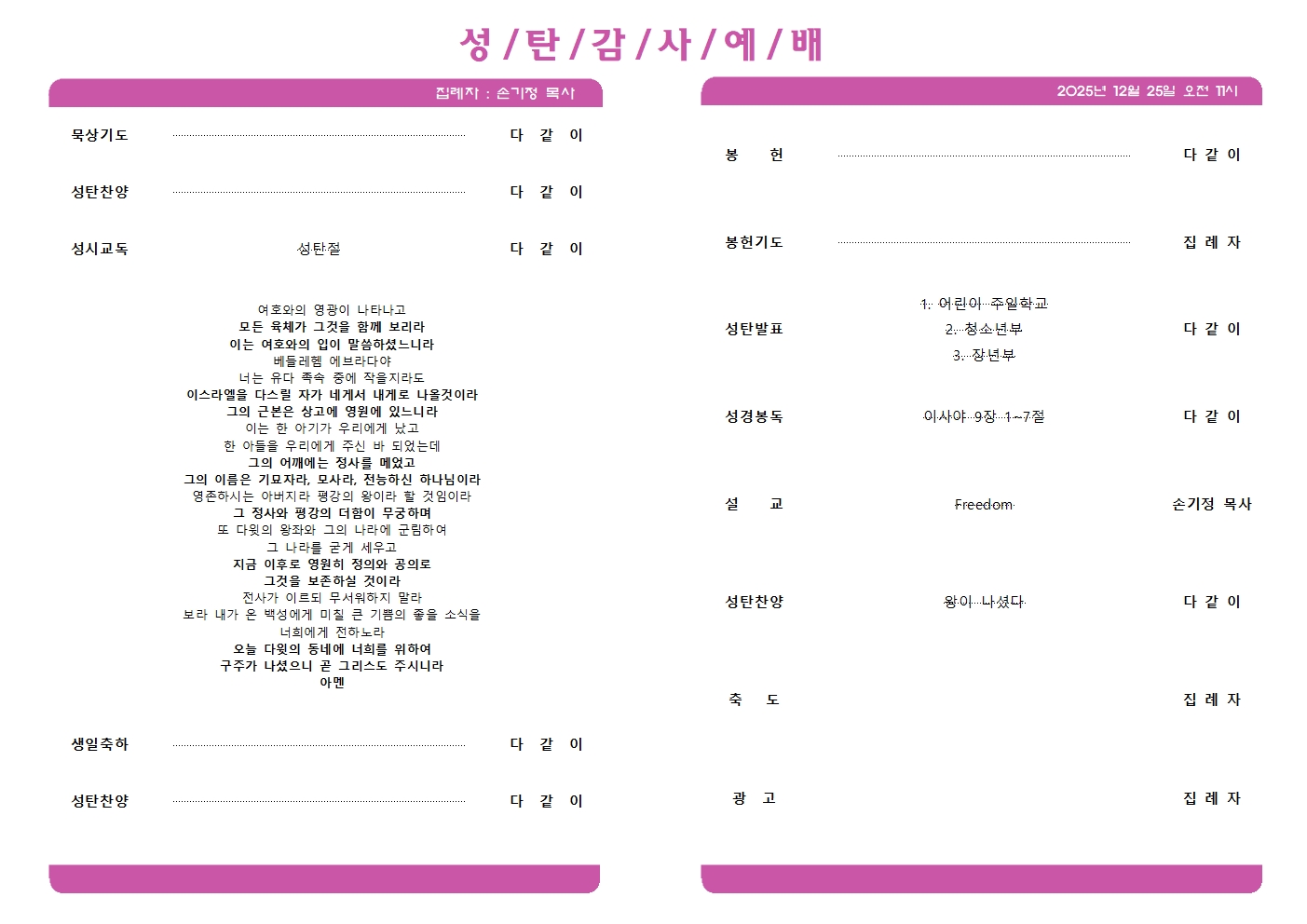 | 2025년 12월 21일 주일예배 주보 (0) | 2025.12.21 |