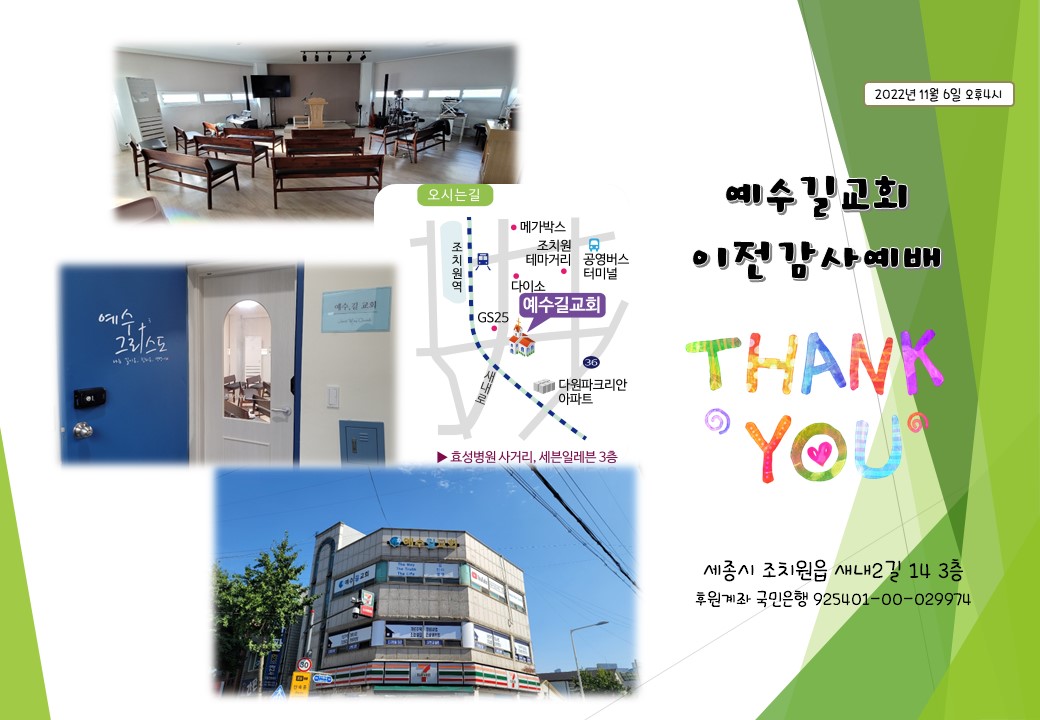| 2022년 11월 6일 예수길교회 이전감사예배 (0) | 2022.11.05 |