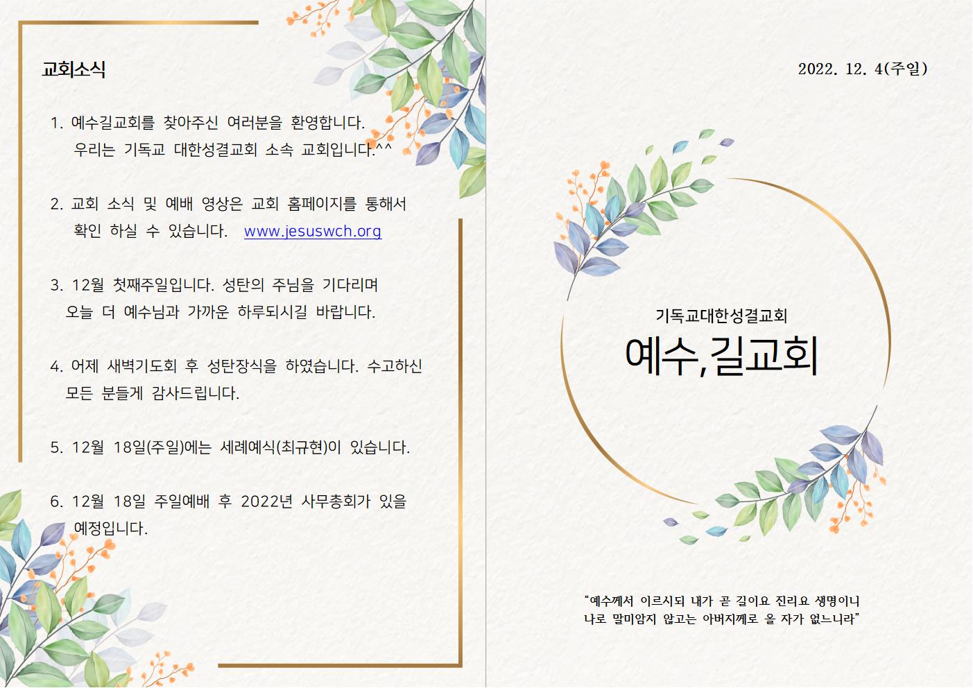| 2022년 12월 11일 주일예배 주보 (0) | 2022.12.11 |
