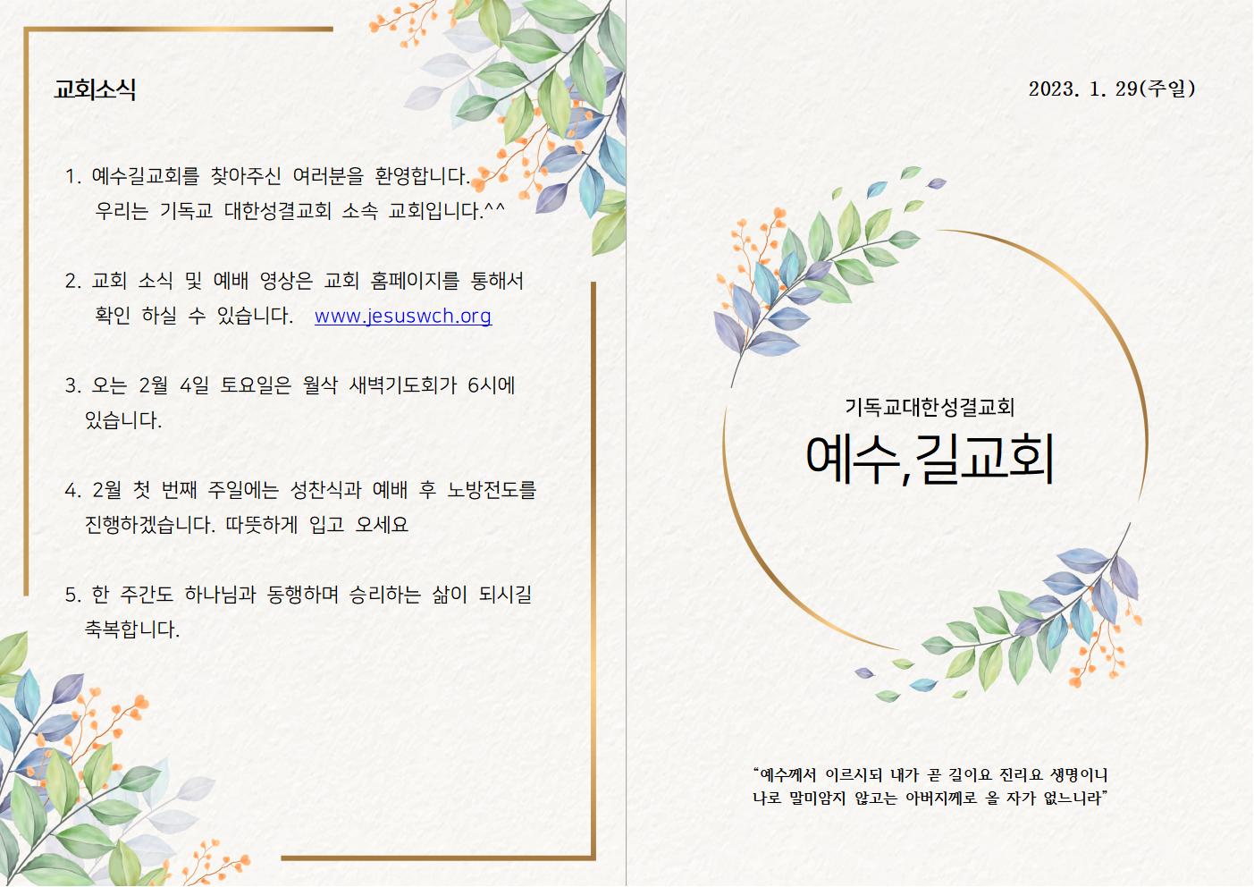 | 2023년 1월 22일 주일예배 주보 (0) | 2023.01.22 |