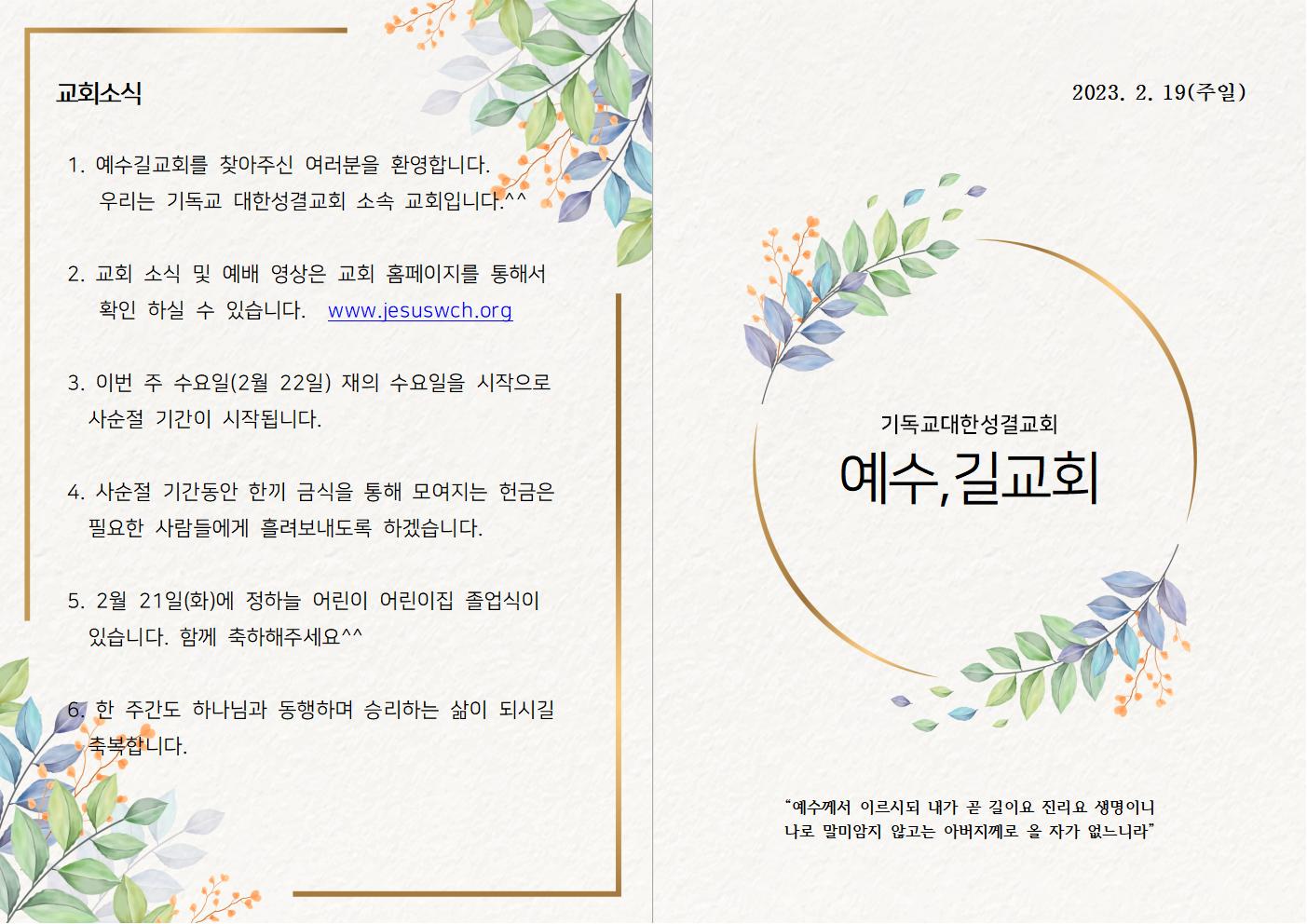 | 2023년 2월 26일 주일예배 주보 (0) | 2023.02.26 |