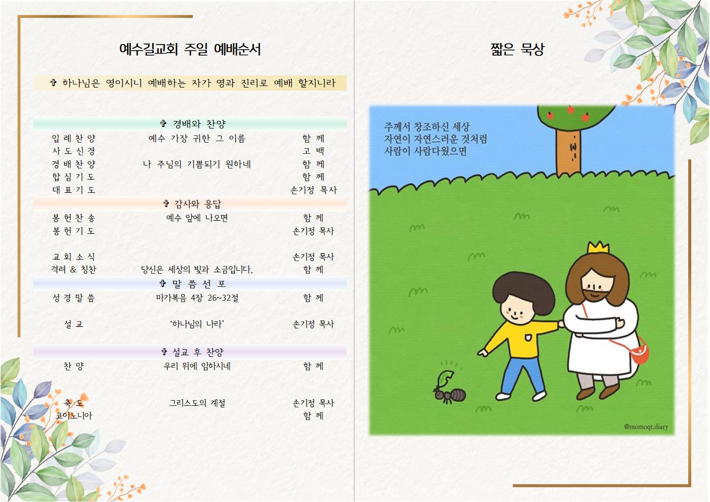 | 2023년 3월 5일 주일예배 주보 (0) | 2023.03.05 |
