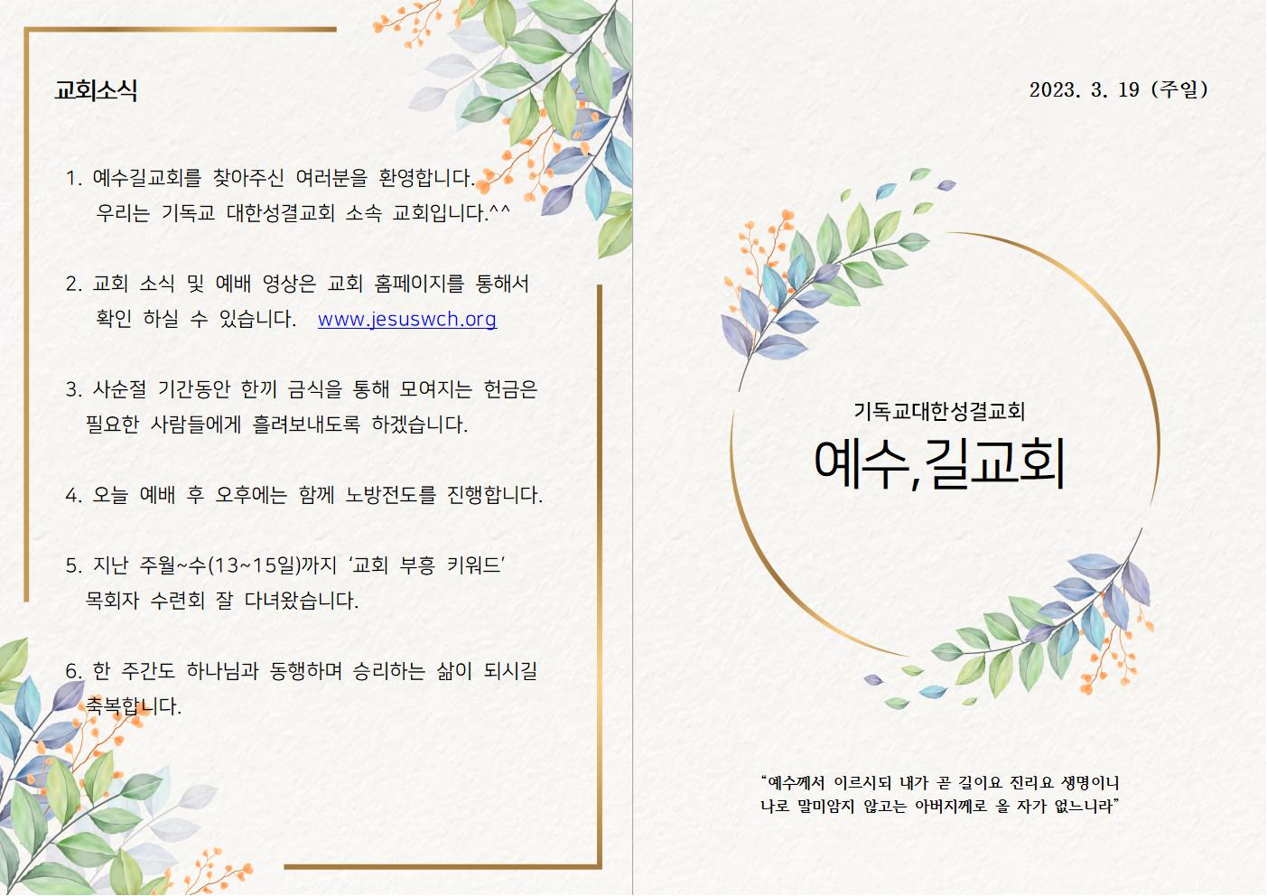 | 2023년 3월 5일 주일예배 주보 (0) | 2023.03.05 |
