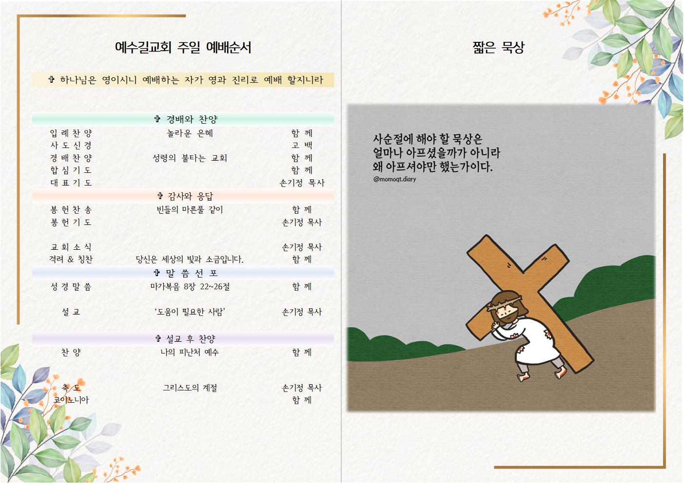 | 2023년 4월 2일 주일예배 주보 (0) | 2023.04.02 |