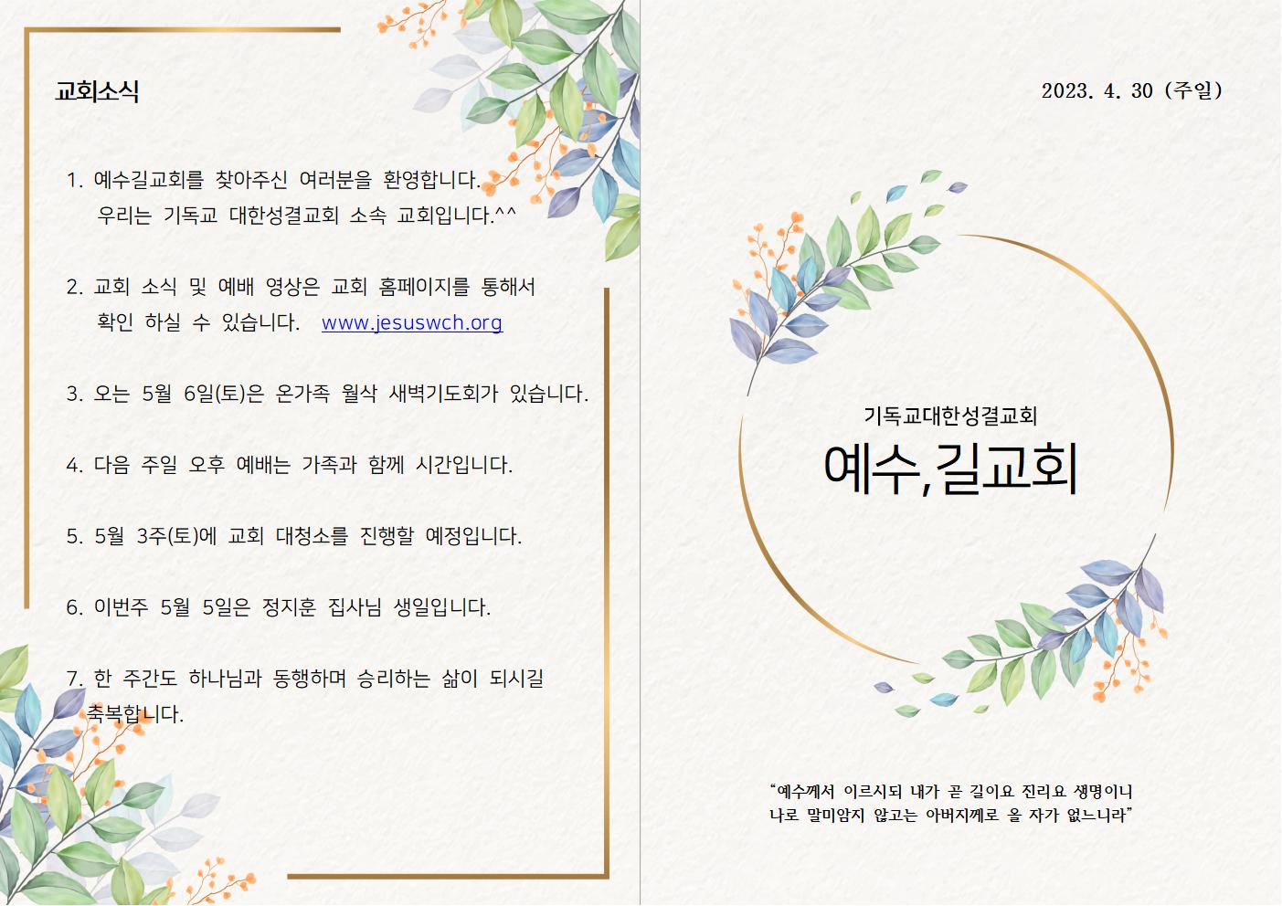 | 2023년 4월 23일 주일예배 주보 (0) | 2023.04.23 |