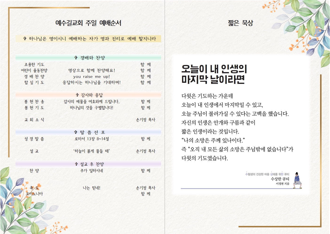 | 2023년 8월 6일 주일예배 주보 (0) | 2023.08.06 |