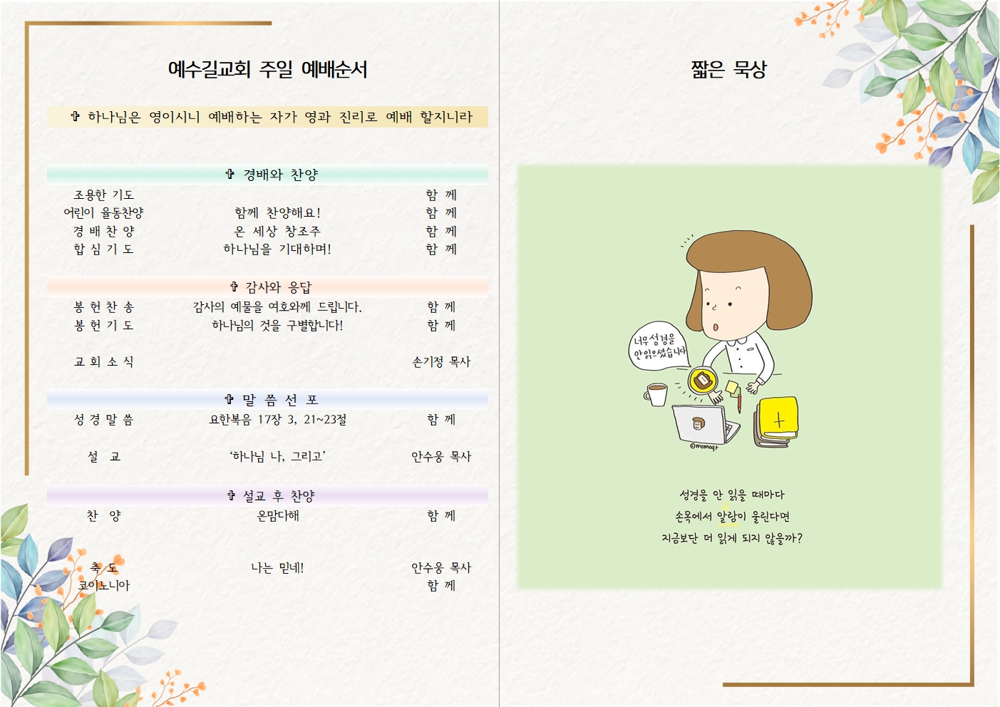 | 2024년 7월 21일 주일예배 주보 (0) | 2024.07.21 |