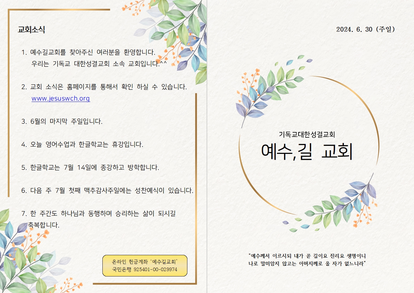 2024년 6월 30일 예수길교회 주보