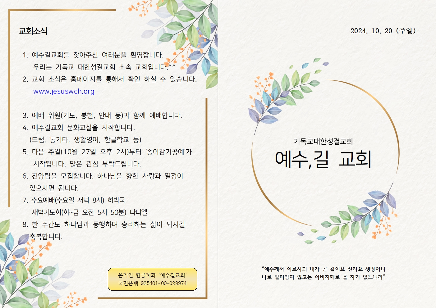2024년 10월 20일 주일예배 주보